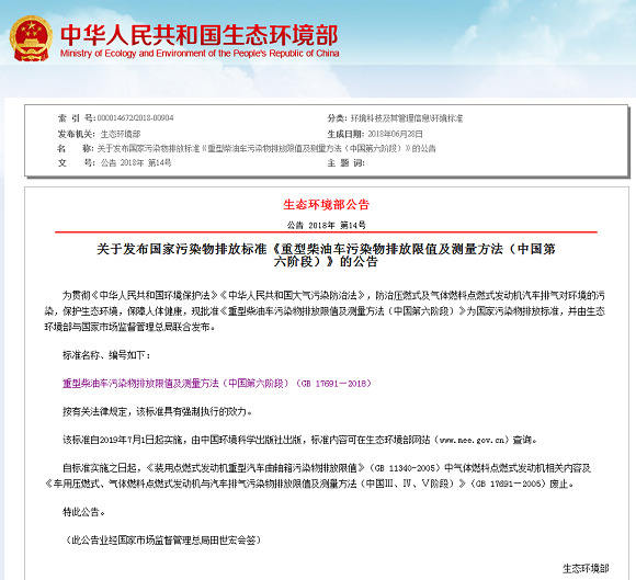 7月3日,生态环境部在其官网上刊发“关于发布国家污染物排放标准《重型柴油车污染物排放限值及测量方法(中国第六阶段)》的公告”(以下简称“公告”)。公告称,为贯彻《中华人民共和国环境保护法》《中华人民共和国大气污染防治法》,防治压燃式及气体燃料点燃式发动机汽车排气对环境的污染,保护生态环境,保障人体健康,现批准《重型柴油车污染物排放限值及测量方法(中国第六阶段)》为国家污染物排放标准,并由生态环境部与国家市场监督管理总局联合发布。