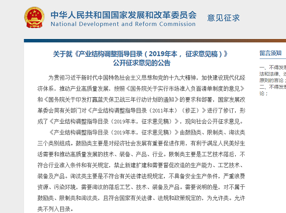 国家发改委4月8日发布了《关于就《产业结构调整指导目录(2019年本, 征求意见稿)》,为《产业结构调整指导目录(2019年本,征求意见稿)》(以下简称“意见稿”)公开征求意见,此次公开征求意见的时间为2019年4月8日至2019年5月7日。 [详细]
