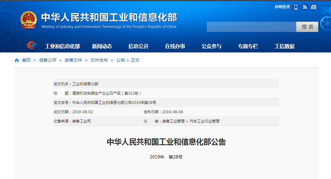 8月6日,工业和信息化部在官方网站发布了第322批《道路机动车辆生产企业及产品公告》。申报本批《公告》的汽车、摩托车、低速汽车生产企业共计653户,新产品共计2970个。 [详细]