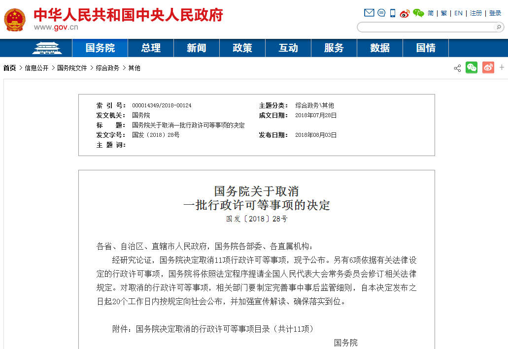 8月3日,中国政府网公布了《国务院关于取消一批行政许可等事项的决定》。经研究论证,国务院决定取消11项行政许可等事项,其中包括了“机动车维修经营许可”。另外,自本决定发布之日起20个工作日内按规定向社会公布,并加强宣传解读、确保落实到位。