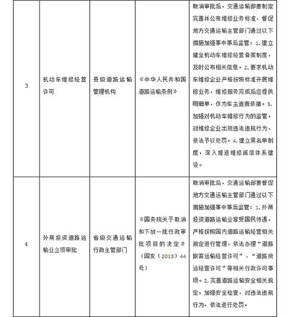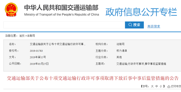 交通部公布十项交通运输行政许可事项取消下放后事中事