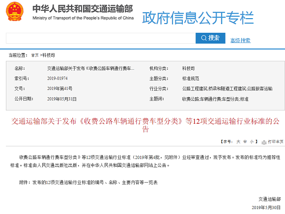 交通部发布收费公路车辆通行费车型分类等12项交通运输