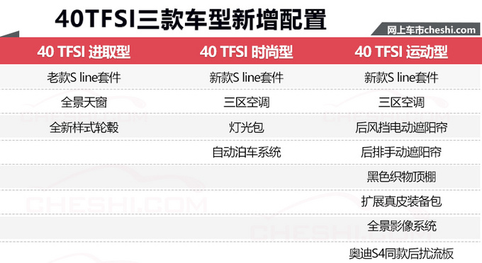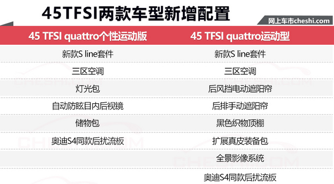 配置方面,奥迪新款A4L 40 TFSI运动型和45 TFSI quattro运动型两款车型配置变化明显,均新增了新款S line套件、三区空调、后风挡电动遮阳帘、后排手动遮阳帘、黑色织物顶棚、扩展真皮装备包、全景影像以及奥迪S4同款后扰流板共8项配置。
