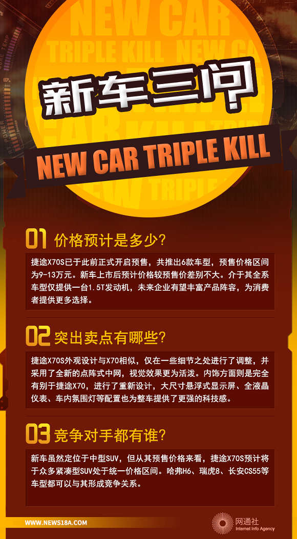 捷途X70S定位为中型SUV,于广州车展期间开启预售,6款车型的预售价格区间为9-13万元。11月26日,网通社从捷途汽车官方获悉,捷途X70S将于今日正式上市。新车外观整体设计与X70相仿,但采用了全新式样的进气格栅,内饰也进行了重新设计,采用悬浮式显示屏以及贯穿式空调出风口等元素,科技感大幅提升。