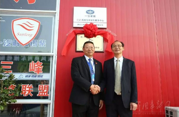 一汽解放发动机事业部总经理助理张振锋与湖北三峰汽车销售服务有限公司总经理李冰峰一起,共同为一汽解放锡柴湖北服务中心举行揭牌仪式。