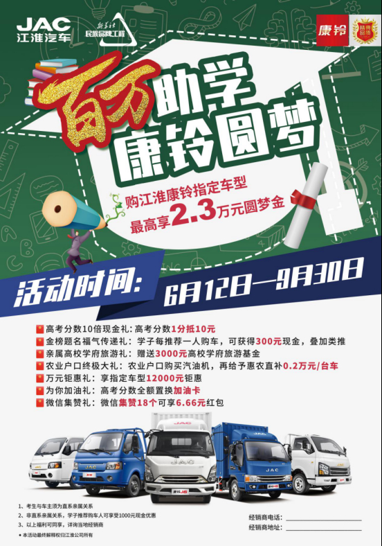 活动期间凭子女本年度高校录取通知书,在经销商处购江淮康铃指定车型最高可享受12000元现金优惠。