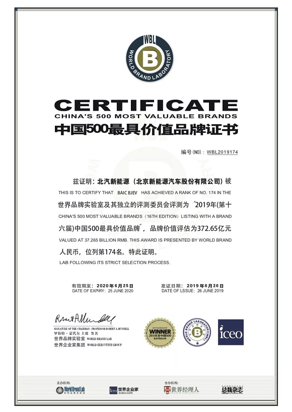 6月26日,2019年第十六届世界品牌大会暨2019中国500最具价值品牌发布会在北京召开。在会上世界品牌实验室发布了《中国500最具价值品牌》报告。北汽新能源以372.65亿元的品牌价值位列总榜单第174位,入围车企中排名第17位,连续两年成为唯一入榜的新能源汽车企业。相较于去年,北汽新能源的品牌价值增长了70亿,同比增长23%。