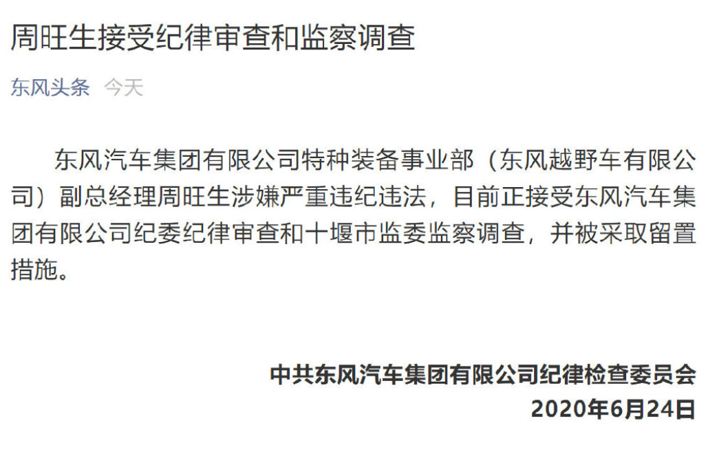 6月28日,东风头条发布了一则通告。该通告显示,东风汽车集团有限公司特种装备事业部(东风越野车有限公司)副总经理周旺生涉嫌严重违纪违法,目前正在接受东风汽车集团有限公司纪委纪律审查和十堰市监委监察调查,并被采取留置措施。