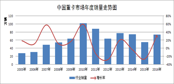 中国重卡市场总需求从2010年的100万辆下滑至2015年的55万辆,2016年下半年重卡市场异军突起,带动全年同比增速超过33%,需求总量恢复到73万辆以上。重卡市场这种良好的需求走势会呈现什么样的需求特点呢?这种近乎有点疯狂的市场需求会延续吗?本文将尝试通过对当前重卡市场的需求分析和2017年的整体需求展望预测对这个问题进行简要分析。