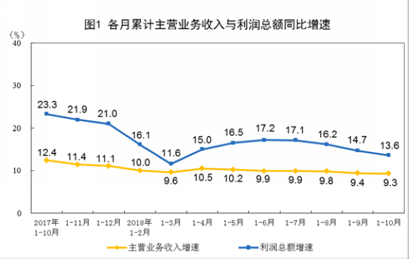 1-10月份,全国规模以上工业企业实现利润总额55211.8亿元,同比增长13.6%(按可比口径计算,考虑统计制度规定的口径调整、统计执法增强、剔除重复数据、企业改革剥离等因素影响,详见附注二),增速比1-9月份放缓1.1个百分点。