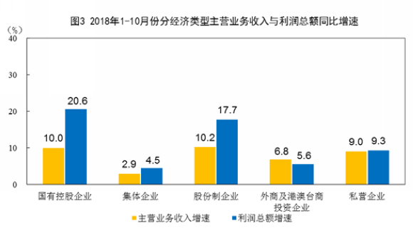 1-10月份,规模以上工业企业中,国有控股企业实现利润总额16724亿元,同比增长20.6%;集体企业实现利润总额167.7亿元,增长4.5%;股份制企业实现利润总额38978.4亿元,增长17.7%;外商及港澳台商投资企业实现利润总额13802亿元,增长5.6%;私营企业实现利润总额14131.6亿元,增长9.3%。