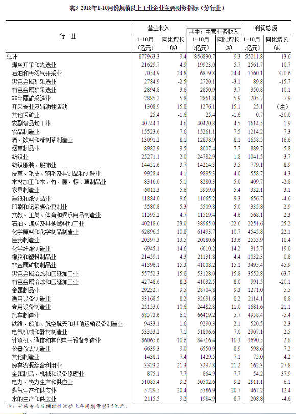 1-10月份,在41个工业大类行业中,34个行业利润总额同比增加,7个行业减少。主要行业利润情况如下:煤炭开采和洗选业利润总额同比增长10.7%,石油和天然气开采业增长3.7倍,农副食品加工业增长1.9%,纺织业增长3.7%,石油、煤炭及其他燃料加工业增长25.2%,化学原料和化学制品制造业增长22.1%,非金属矿物制品业增长45.9%,黑色金属冶炼和压延加工业增长63.7%,通用设备制造业增长8.8%,专用设备制造业增长21.1%,电气机械和器材制造业增长2.5%,计算机、通信和其他电子设备制造业增长2.8%,电力、热力生产和供应业增长6.1%,有色金属冶炼和压延加工业下降20.1%,汽车制造业下降5.4%。