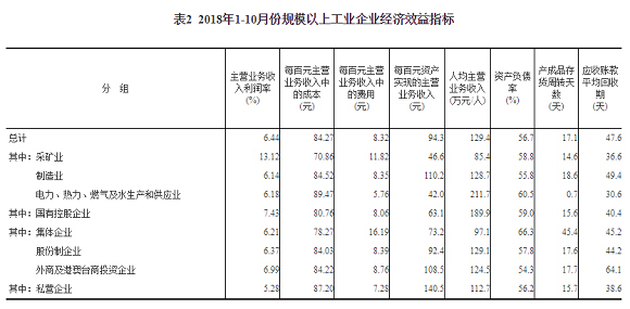 1-10月份,规模以上工业企业每百元主营业务收入中的成本为84.27元,同比减少0.25元;每百元主营业务收入中的费用为8.32元,同比持平;每百元资产实现的主营业务收入为94.3元,同比增加1.9元;人均主营业务收入为129.4万元,同比增加15.1万元;产成品存货周转天数为17.1天,同比持平;应收账款平均回收期为47.6天,同比增加0.4天。