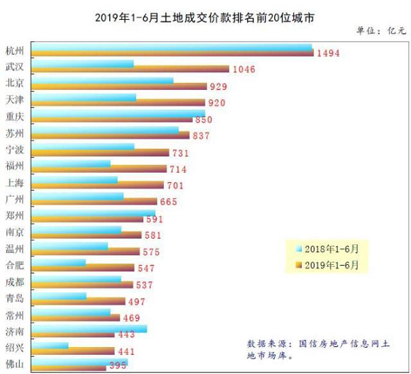 国家信息中心信息化和产业发展部称,今年上半年,杭州以1494亿元的成交价款蝉联城市排名第一;武汉异军突起,由上年同期的第9名前进7名,占据榜眼的位置;北京则由上年同期的第4名前进1名,排名第3。