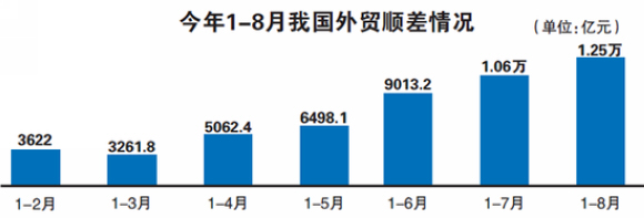 具体来看,8月我国贸易顺差为1797.5亿元,收窄34.2%。而7月的贸易顺差为1769.6亿元,收窄42.6%。统计显示,自2016年三季度以来,我国货物贸易进口实现较快增长,进口增速持续高于出口增速,贸易顺差已连续8个季度呈收窄态势。不过,值得注意的是,我国对美贸易顺差仍然呈扩大趋势,前8个月我国对美国出口1.96万亿元,增长6.5%;自美国进口7141.3亿元,增长4.4%,贸易顺差扩大7.7%。