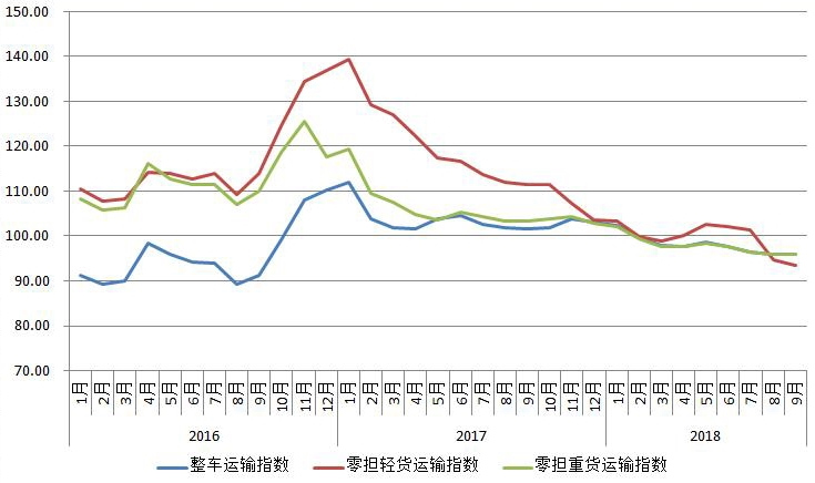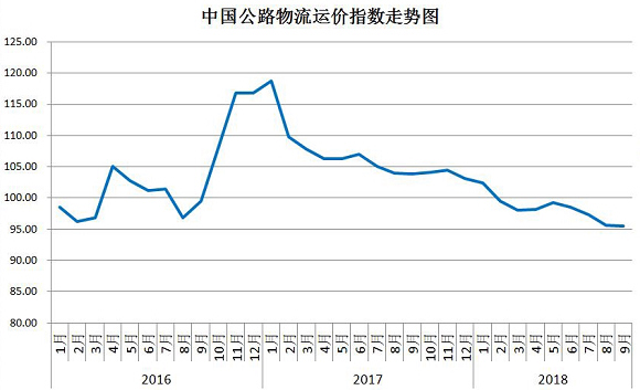由中国物流与采购联合会和林安物流集团联合调查的2018年9中国公路物流运价指数为95.5点,比上月回落0.15%。