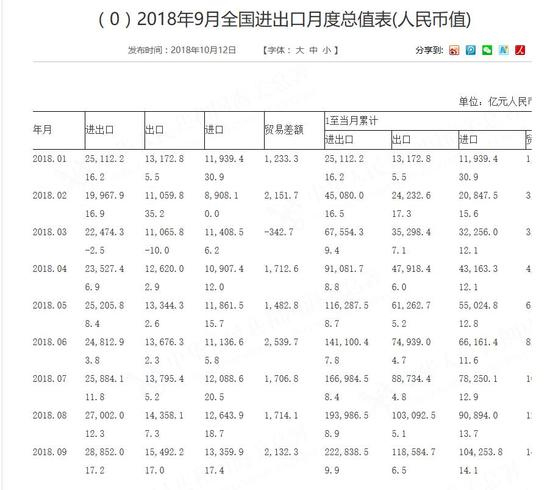 2018年前三季度,我国货物贸易进出口总值22.28万亿元人民币,比去年同期(下同)增长9.9%。其中,出口11.86万亿元,增长6.5%;进口10.42万亿元,增长14.1%;贸易顺差1.44万亿元,收窄28.3%。