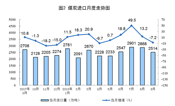 9月份,进口煤炭2514万吨,比上月减少354万吨,同比下降7.2%。1-9月份,进口煤炭2.3亿吨,同比增长11.8%。