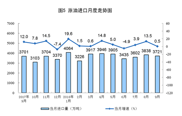 原油进口增速回落。9月份进口原油3721万吨,同比增长0.5%,增速比上月回落13.0个百分点,进口量环比减少117万吨。1-9月份,进口原油33641万吨,同比增长5.9%。