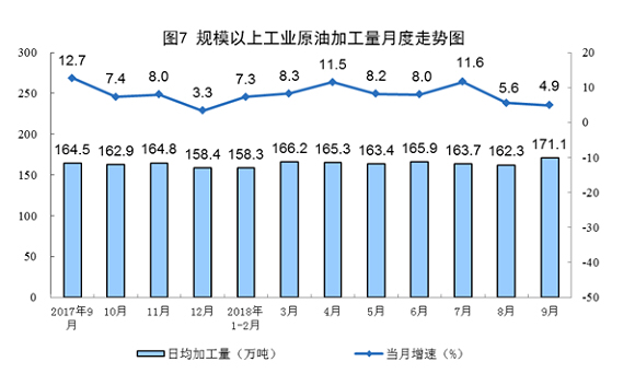 9月份,原油加工量5134万吨,同比增长4.9%,增速比上月回落0.7个百分点;日均加工171.1万吨,环比增加8.8万吨。1-9月份,原油加工量45254万吨,同比增长8.1%。
