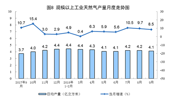 9月份,规模以上工业原煤生产加快;原油生产下降,原油加工量稳定增长;天然气生产保持较快增长;电力生产增速有所放缓。