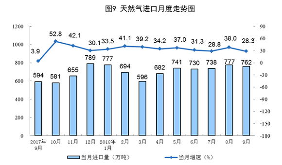 9月份,进口天然气762万吨,同比增长28.3%,增速比上月回落9.7个百分点,进口量环比减少15万吨。1-9月份,进口天然气6478万吨,同比增长34.0%。