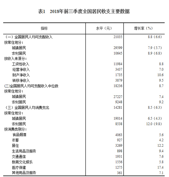 2018年前三季度,全国居民人均可支配收入21035元,比上年同期名义增长8.8%,扣除价格因素,实际增长6.6%。其中,城镇居民人均可支配收入29599元,增长(以下如无特别说明,均为同比名义增长)7.9%,扣除价格因素,实际增长5.7%;农村居民人均可支配收入10645元,增长8.9%,扣除价格因素,实际增长6.8%。