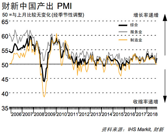 11月份,财新中国综合 PMI 数据(包括制造业和服务业)显示中国经济活动整体增长势头改善,综合产出指数从 10月份的 28 个月低点(50.5)回升至 51.9,显示综合产出有小幅增长。
