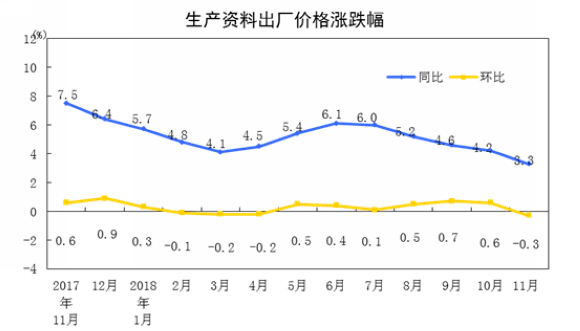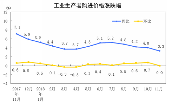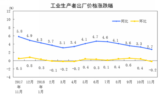 2018年11月份,全国工业生产者出厂价格同比上涨2.7%,环比下降0.2%。工业生产者购进价格同比上涨3.3%,环比持平。1-11月平均,工业生产者出厂价格比去年同期上涨3.8%,工业生产者购进价格上涨4.4%。
