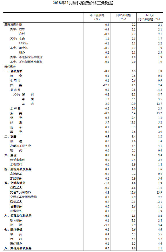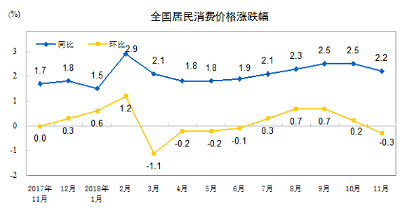2018年11月份,全国居民消费价格同比上涨2.2%。其中,城市上涨2.2%,农村上涨2.2%;食品价格上涨2.5%,非食品价格上涨2.1%;消费品价格上涨2.2%,服务价格上涨2.1%。1-11月平均,全国居民消费价格比去年同期上涨2.1%。