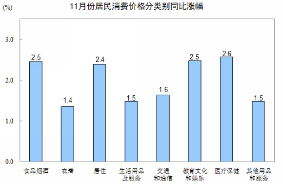 其他七大类价格同比均上涨。其中,医疗保健、教育文化和娱乐价格分别上涨2.6%和2.5%,居住、交通和通信价格分别上涨2.4%和1.6%,生活用品及服务、其他用品和服务、衣着价格分别上涨1.5%、1.5%和1.4%。