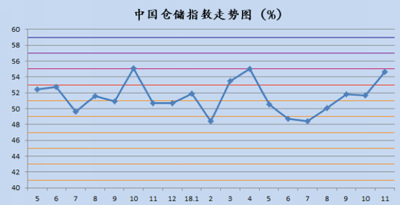 中国物流与采购联合会发布的2018年11月份中国物流业景气指数为55.9%较上月回升1.4个百分点;中国仓储指数为54.6%,较上月回升2.9个百分点。