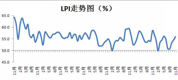 业务总量指数回升,需求保持旺盛。11月份,业务总量指数回升1.4个百分点,为55.9%,其中运输业、仓储业和邮政业均保持快速增长。