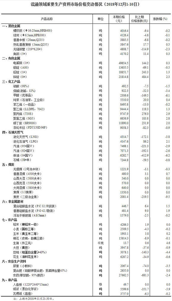 据对24个省(区、市)流通领域9大类50种重要生产资料市场价格的监测显示,2018年12月上旬与11月下旬相比,16种产品价格上涨,27种下降,7种持平。
