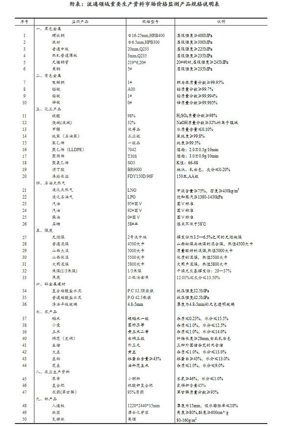 流通领域重要生产资料市场价格监测内容包括9大类50种产品的价格。类别与产品规格说明详见附表。