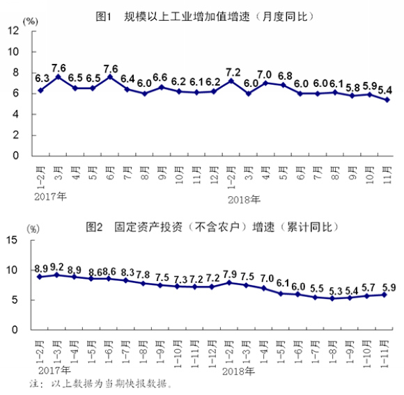 11月份,全国规模以上工业增加值同比实际增长5.4%,增速比上月回落0.5个百分点。分经济类型看,国有控股企业增加值同比增长3.9%,集体企业增长2.0%,股份制企业增长6.6%,外商及港澳台商投资企业增长1.9%。分三大门类看,采矿业增加值同比增长2.3%,制造业增长5.6%,电力、热力、燃气及水生产和供应业增长9.8%。1-11月份,全国规模以上工业增加值同比增长6.3%,比1-10月份回落0.1个百分点;其中,高技术制造业、装备制造业增加值同比分别增长