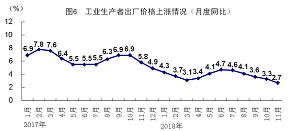 11月份,全国居民消费价格同比上涨2.2%,涨幅比上月回落0.3个百分点,环比下降0.3%。分类别看,食品烟酒价格同比上涨2.5%,衣着上涨1.4%,居住上涨2.4%,生活用品及服务上涨1.5%,交通和通信上涨1.6%,教育文化和娱乐上涨2.5%,医疗保健上涨2.6%,其他用品和服务上涨1.5%。1-11月份,全国居民消费价格同比上涨2.1%。11月份,全国工业生产者出厂价格同比上涨2.7%,涨幅比上月回落0.6个百分点,环比下降0.2%;工业生产者购进价格同比上涨3.3%,环比与上月持平。1-11月份,全国工业生产者出厂价格同比上涨3.8%,工业生产者购进价格同比上涨4.4%。