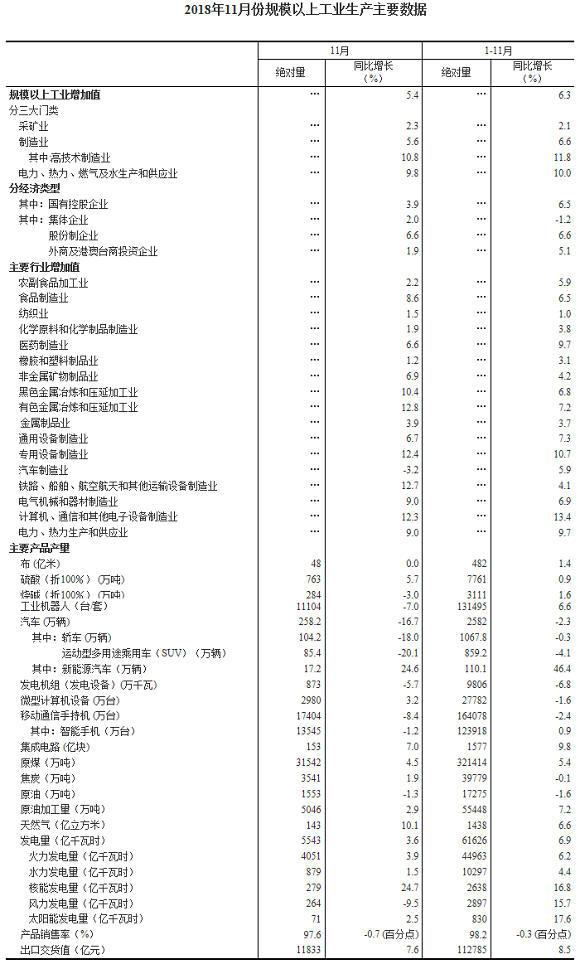 12月14日统计局发布数据,2018年11月份,规模以上工业增加值同比实际增长5.4%(以下增加值增速均为扣除价格因素的实际增长率),增速比10月份回落0.5个百分点;环比增长0.36%。1-11月份,规模以上工业增加值同比增长6.3%,增速较1-10月份回落0.1个百分点。