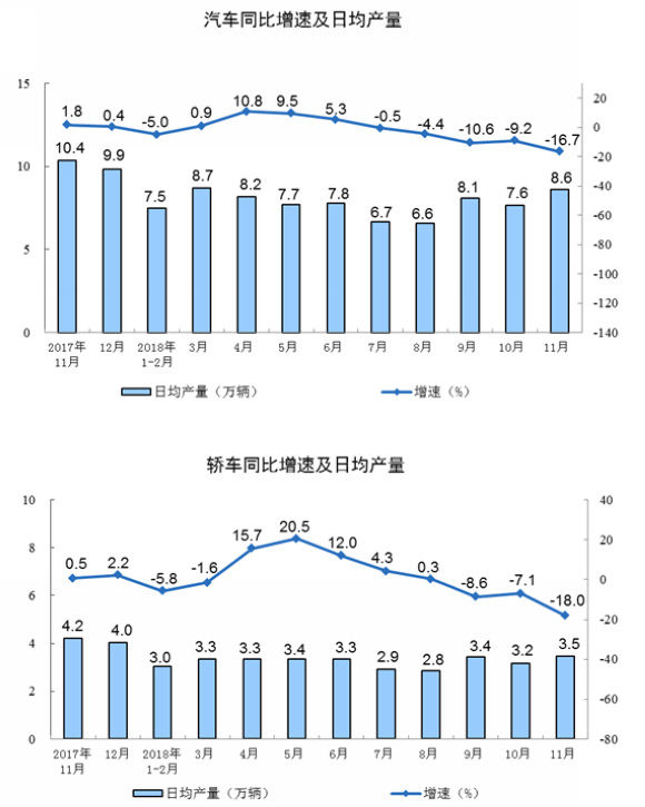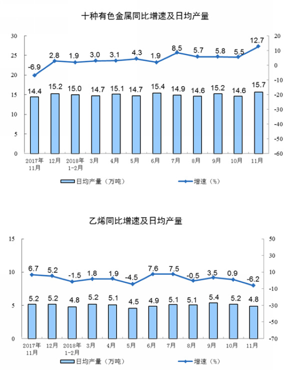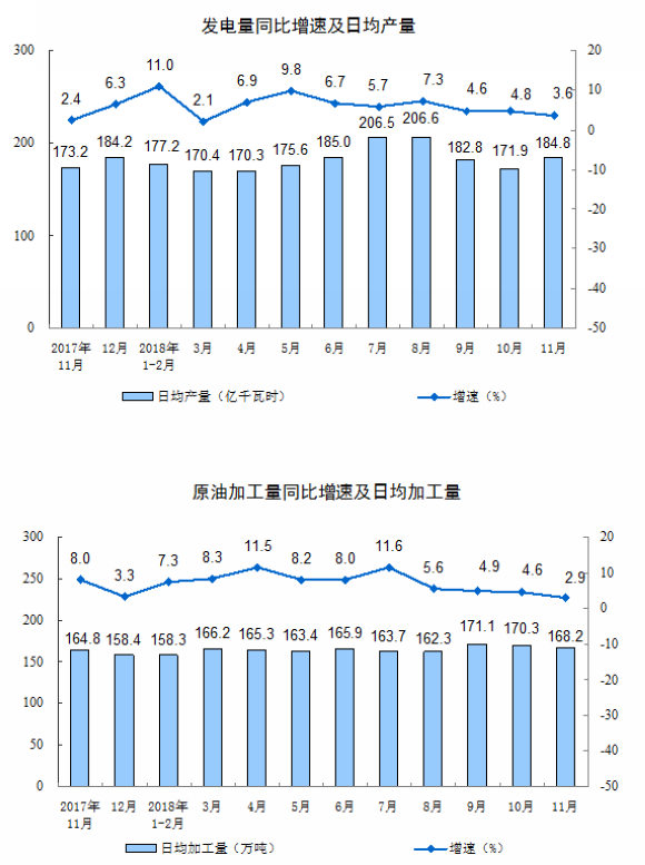 分产品看,11月份,596种产品中有301种产品同比增长。其中,钢材9424万吨,同比增长11.3%;水泥20521万吨,增长1.6%;十种有色金属471万吨,增长12.7%;乙烯145万吨,下降6.2%;汽车258.2万辆,下降16.7%,其中,轿车104.2万辆,下降18.0%;发电量5543亿千瓦时,增长3.6%;原油加工量5046万吨,增长2.9%。