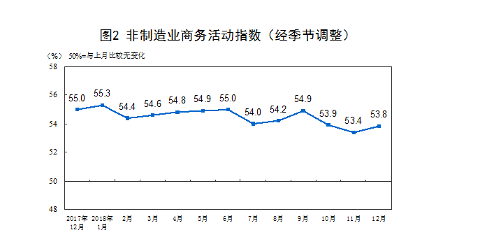 2018年12月份,中国非制造业商务活动指数为53.8%,比上月上升0.4个百分点,表明非制造业扩张有所加快。