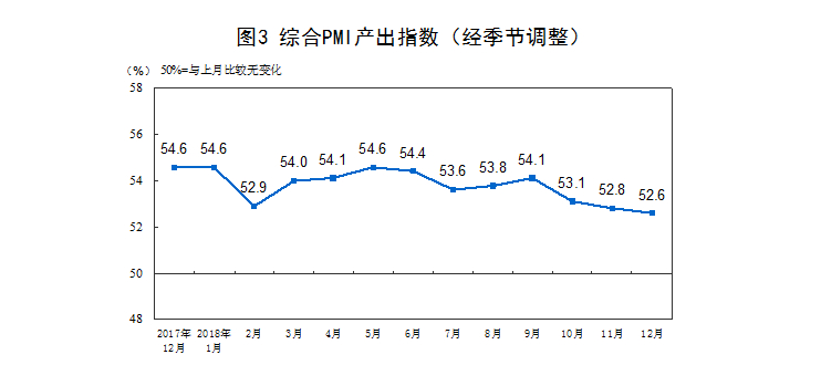 2018年12月份,综合PMI产出指数为52.6%,比上月回落0.2个百分点,继续位于景气区间,表明我国企业生产经营活动总体延续扩张态势,扩张步伐有所放缓。