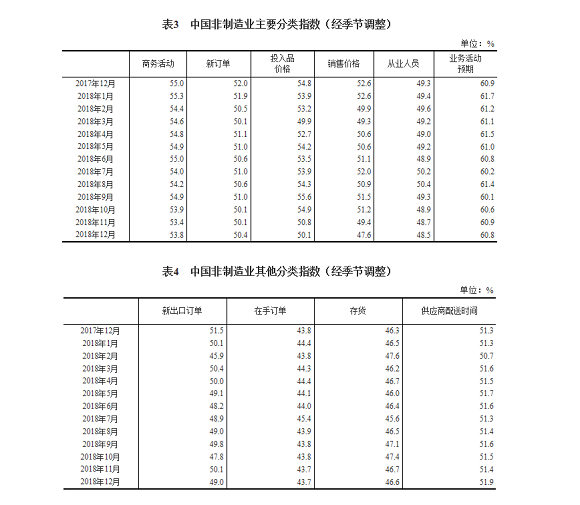 (1)分类指数的计算方法。制造业采购经理调查指标体系包括生产、新订单、新出口订单、在手订单、产成品库存、采购量、进口、主要原材料购进价格、出厂价格、原材料库存、从业人员、供应商配送时间、生产经营活动预期等13个分类指数。非制造业采购经理调查指标体系包括商务活动、新订单、新出口订单、在手订单、存货、投入品价格、销售价格、从业人员、供应商配送时间、业务活动预期等10个分类指数。分类指数采用扩散指数计算方法,即正向回答的企业个数百分比加上回答不变的百分比的一半。由于非制造业没有合成指数,国际上通常用商务活动指数反映非制造业经济发展的总体变化情况。