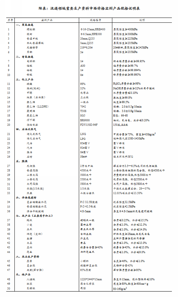 流通领域重要生产资料市场价格监测内容包括9大类50种产品的价格。类别与产品规格说明详见附表。