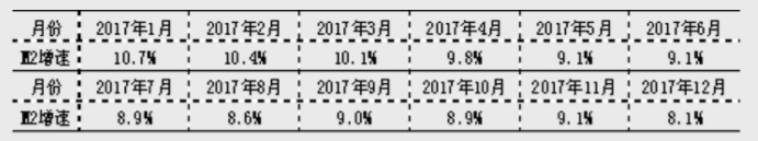 注2:2018年1月,人民银行完善货币供应量中货币市场基金部分的统计方法,用非存款机构部门持有的货币市场基金取代货币市场基金存款(含存单)。完善后,2017年各月末M2增速如下: