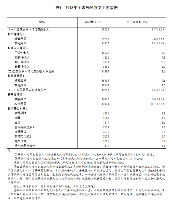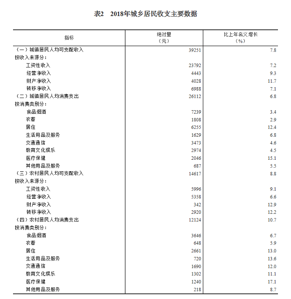 2018年,全国居民人均可支配收入28228元,比上年名义增长8.7%,扣除价格因素,实际增长6.5%。其中,城镇居民人均可支配收入39251元,增长(以下如无特别说明,均为同比名义增长)7.8%,扣除价格因素,实际增长5.6%;农村居民人均可支配收入14617元,增长8.8%,扣除价格因素,实际增长6.6%。
