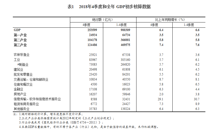 根据有关基础资料和国民经济核算方法,我国2018年四季度和全年国内生产总值(以下简称GDP)初步核算主要结果如下:
