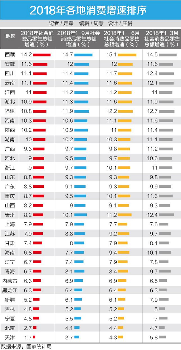 ,比上一年的10.2%增速有所下降。从31个省份的数据来看,西藏、安徽、四川、云南等10个省份仍保持两位数以上的增速,其中,中部省份占据五席,分别为安徽、江西、湖北、河南、湖南。与此同时,部分经济发达地区增速低迷。比如京津2018年的增速分别只有2.7%、1.7%,全国排名垫底。