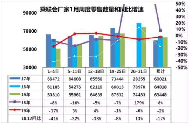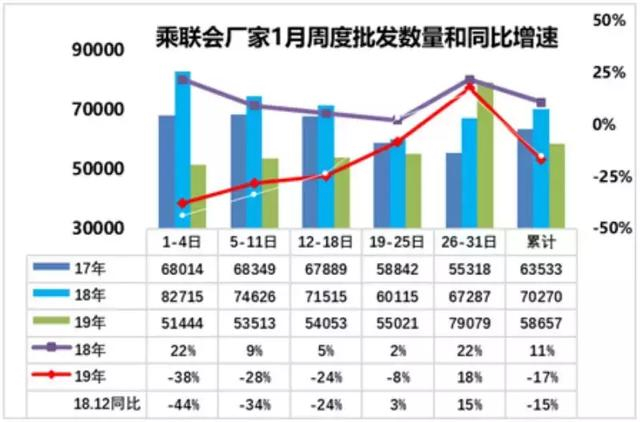 同样受春节假期的影响,1月份乘用车市场厂家批发给经销商的新车数量较少。根据乘联会统计的数据显示,与去年同期相比,下降了17%。在这个基础上,1月份累计销量同比下降2%。少了大部分的批发数量,经销商库存预警指数自然会有所下降。