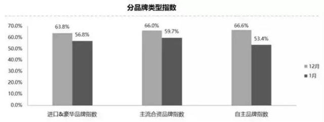 看似车市依然还没回暖,不过1月的库存预警指数环比去年12月份下降了7.2%,同比下降8.3%,紧绷的库存量有明显的减少。如果分品牌来看,不管是自主品牌、合资品牌还是进口&豪华品牌,其库存预警指数都有明显的下降。