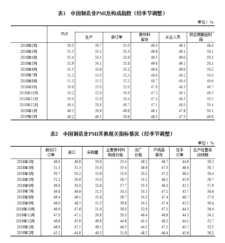 2019年2月份,中国制造业采购经理指数(PMI)为49.2%,比上月下降0.3个百分点。